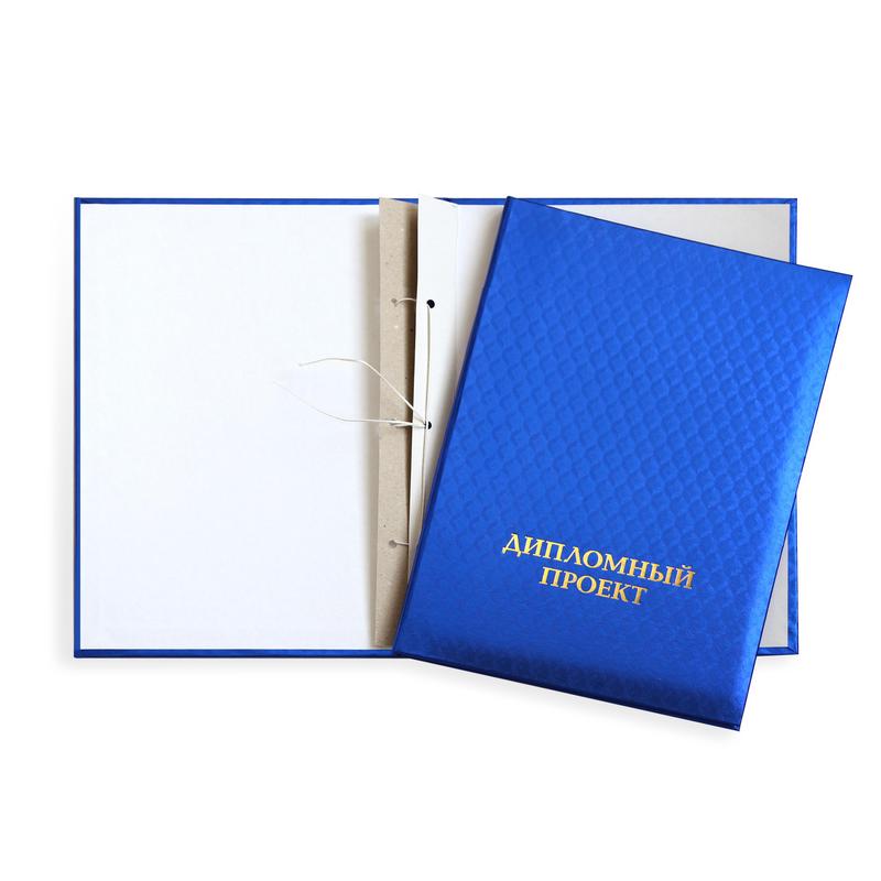 Обложка адресной папки «Дипломный проект» изготовлена из переплетного картона, оклеенного полипропиленом синего цвета (дизайн в ассортименте). Внутри расположен гребешок со шнурком для крепления листов или файлов. Выклейка — белая бумага. Надпись на лицевой стороне выполнена золотистыми буквами. Формат адресной папки — А4.