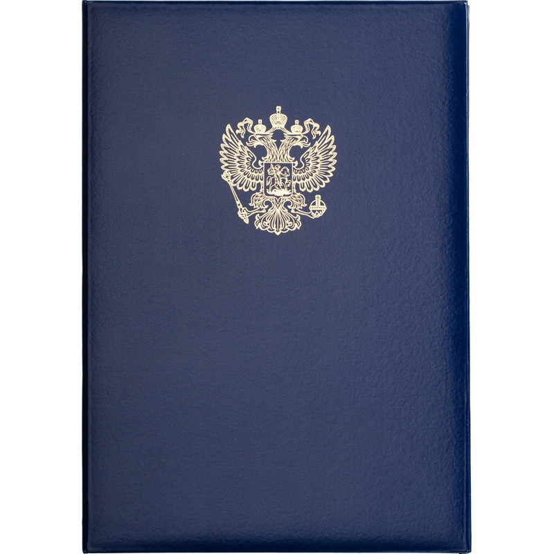 Адресная папка формата А4 изготовлена из бумвинила синего цвета (слой ПВХ на бумажной основе). На обложку методом тиснения золотой фольгой нанесено изображение российского герба. Внутри есть фиксирующая ленточка для бумаг. Адресная папка подходит для поздравлений, подачи документов на подпись.