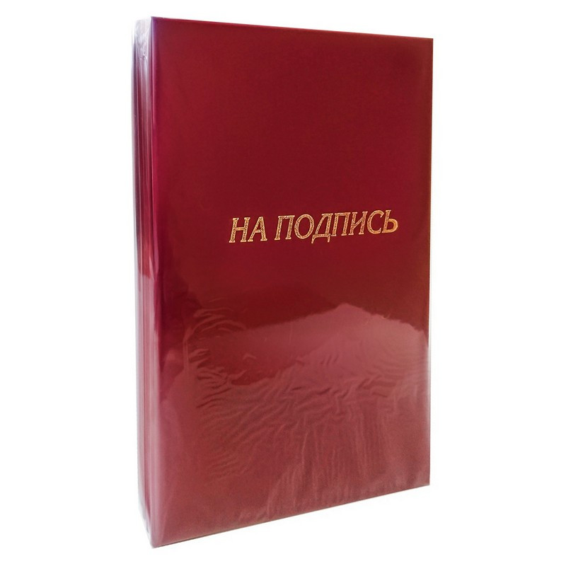 Адресная папка формата А4. Изготовлена из бумвинила (слой ПВХ на бумажной основе), цвета бордо. На обложку методом тиснения золотой фольгой нанесен орнамент и надпись На подпись. Внутренняя отделка - белая бумага. Внутри есть фиксирующая ленточка для бумаг. Адресная папка подходит для подачи документов на подпись.