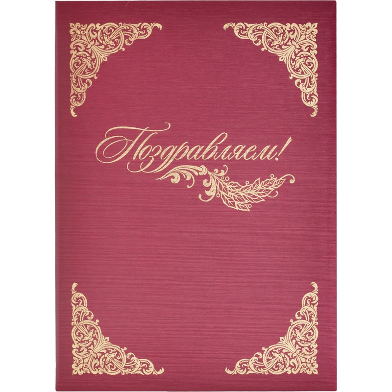 Картонная адресная папка с шелковой поверхностью бордового цвета. На лицевой панели золотом нанесено слово Поздравляем и декоративные виньетки по углам. Внутренняя часть папки оснащена шелковой лентой, удерживающей лист с поздравлениями или открытку.