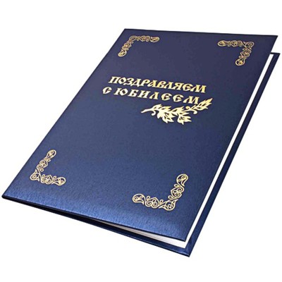 Адресная папка размером 22,5×31 см выполнена из переплетного материала танго синего цвета (слой ПВХ на бумажной основе). Внутренние вклейки — из балакрона (ПВХ с имитацией кожи). На обложке надпись «Поздравляем с юбилеем» и орнамент (тиснение золотой фольгой). Внутрь вложен бланк с праздничным оформлением для написания текста поздравления (со сгибом посередине), есть фиксирующий ремешок.