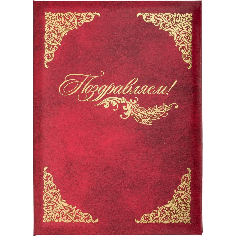 Адресная папка формата А4 изготовлена из бумвинила бордового цвета (слой ПВХ на бумажной основе). На обложку методом тиснения золотой фольгой нанесено 'Поздравляем!' в рамке из четырех уголков. Внутри есть фиксирующая ленточка для бумаг. Адресная папка подходит для поздравлений. Папка поставляется в пакете. Страна происхождения: Россия. Формат: 310x220 мм.