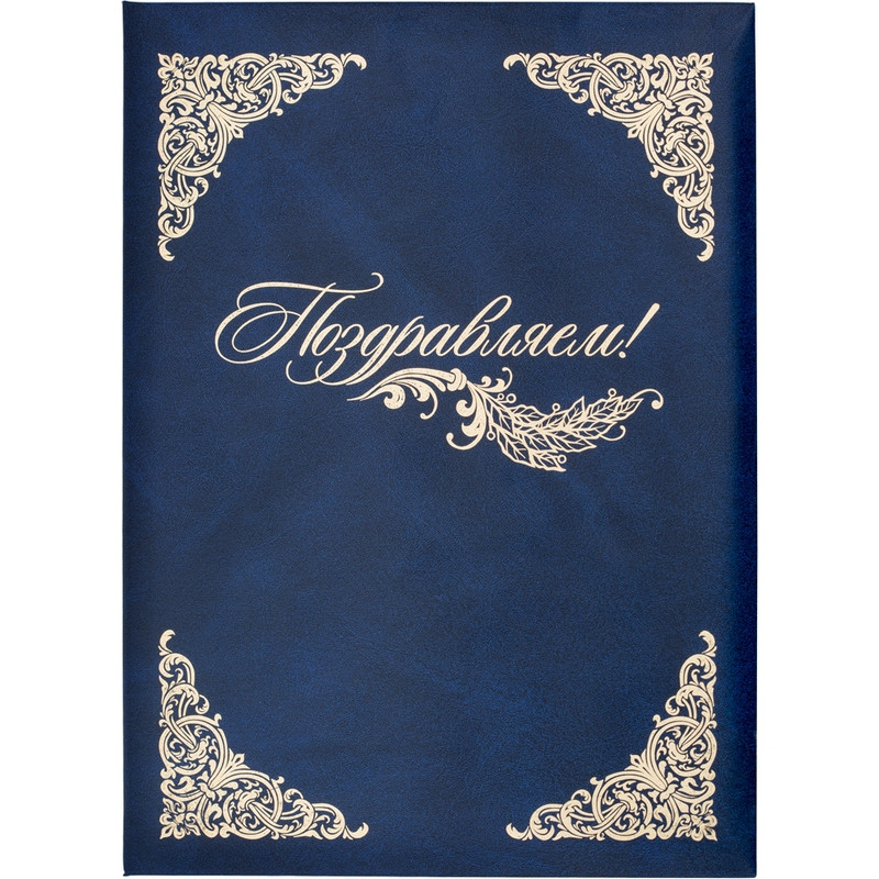 Адресная папка формата А4 изготовлена из бумвинила синего цвета (слой ПВХ на бумажной основе). На обложку методом тиснения золотой фольгой нанесено ?Поздравляем!? в рамке из четырех уголков. Внутри есть фиксирующая ленточка для бумаг. Адресная папка подходит для поздравлений. Папка поставляется в пакете. Страна происхождения: Россия. Формат: 310x220 мм
