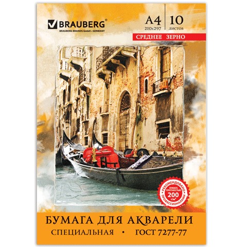 Формат А4 (210х297 мм). Обложка - папка из мелованного картона плотностью 235 г/м2. Внутренний блок - акварельная бумага 200 г/м2 по ГОСТу. 10 листов. Белизна 100%.