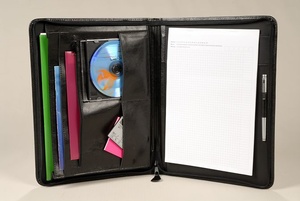 Папка закрывается на молнию по всему периметру, объемный карман для документов, большой карман на молнии, карманы для мелких документов и визиток. Комплектуется отрывным блокнотом формата A4. Цвет чёрный. Материал – заменитель кожи. Размер, мм: 340х260