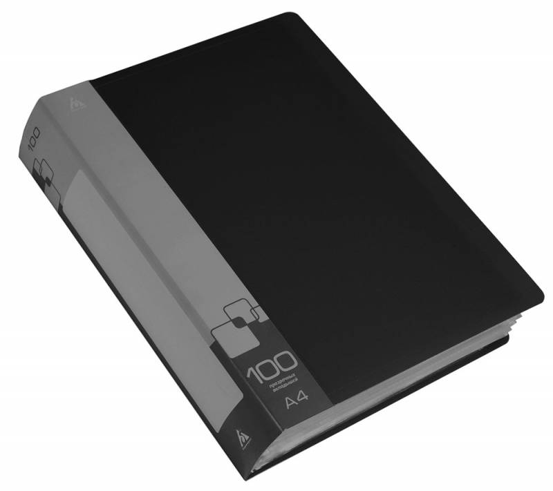 Папка с 100 прозр. вкладышами, ф.А4, пластик 0.80мм, торц. карман с бум. встав., черная, Россия