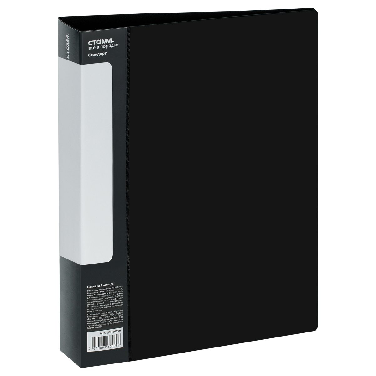 Папка на 2 кольцах СТАММ "Стандарт" предназначена для хранения перфорированных документов формата А4. Цвет папки – чёрный. Изготовлена из качественного полипропилена толщиной 700 мкм с текстурой «песок». Размер изделия составляет 310*250 мм. Ширина корешка 40 мм позволяет вмещать в папку до 250 листов. Кольцевой механизм, состоящий из 2 колец диаметром 25 мм, надёжно держит документы. На корешке и внутренней стороне папки имеется карман. Папка упакована в индивидуальный пакет.