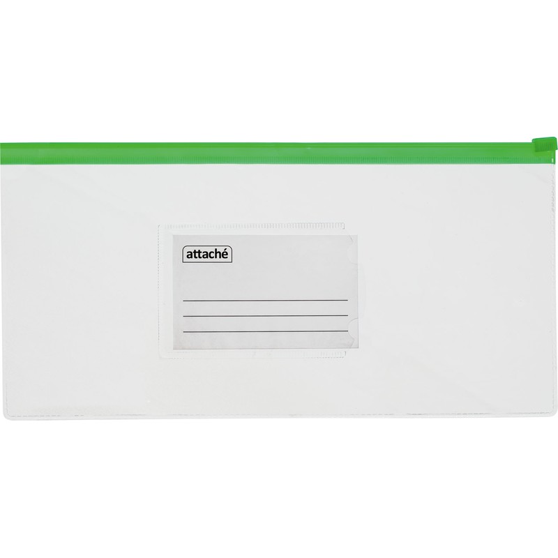 Папка-конверт Attache размером 255×130 мм изготовлена из мягкого прозрачного ПВХ толщиной 0,16 мм, закрывается на пластиковую молнию зеленого цвета. На лицевой стороне — карман для визитной карточки или этикетки. Оптимальна для хранения и переноски билетов. Вместимость 50 листов стандартной плотности.