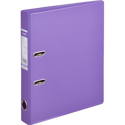 Папка-регистратор формата А4 с арочным механизмом выполнена из плотного картона сиреневого цвета, снаружи и внутри обтянута пленкой из ПВХ. Нижний край — с дополнительным слоем ПВХ для предотвращения царапин на мебели. Механизм из стали не подвержен деформации. Специальные прорези на крышке не дают папке открываться при большом количестве вложенных документов. Корешок шириной 50 мм имеет кольцо для удобного захвата и прозрачный карман со сменной двусторонней этикеткой.