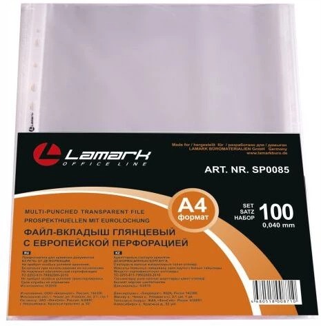 Файлы-вкладыши Lamark глянцевые выполнены из высококачественной полипропиленовой пленки толщиной 0,040 мм, снабжены универсальной перфорацией, предназначены для хранения и транспортировки неперфорированных документов. Размер файла 233+/-2 х 305+/-2 мм, 100 штук в упаковке.