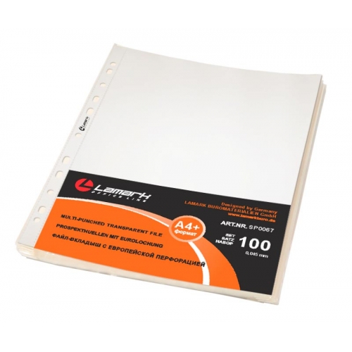 Артикул:SP0067, Название:Файл-вкладыш с перфорацией А4+ 0,045мм повышенной вместимости, "яичная скорлупа" 100шт/упак, Торговая марка:Lamark, Страна:Германия, Упаковка:1/20,