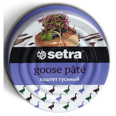 Паштет Setra готовится только из гусиного и куриного мяса. Отличается полным отсутствием пищевых добавок (красителей, консервантов, усилителей вкуса). Упакован в жестяную банку, вес 100г. На крышке предусмотрен ключ для удобства открывания.