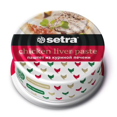 Паштет Setra готовится из печени курицы и куриного мяса. Отличается полным отсутствием пищевых добавок (красителей, консервантов, усилителей вкуса). Упакован в жестяную банку, вес 100г. На крышке предусмотрен ключ для удобства открывания.