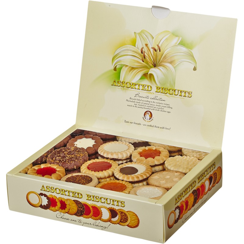 Насыщенный вкус и легая кислинка ,свойственные апельсиновому и вишневому мармеладу.Сдобное глазированное печенье, дополненное изысканными наполнителями крем, орех, кокос.Печенье типа пирожного.С начинкой из крупного дробленого ореха, обжаренного в карамели и шоколадной глазури. Печенье сложено стопкой без разделителей.