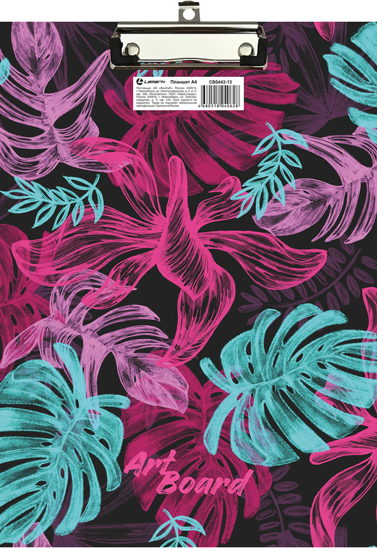 Планшет Lamark c верхним металлическим зажимом выполнен из плотного картона толщиной 2 мм, оклеенного бумагой с ярким принтом "Тропики" с двух сторон. Глянцевая