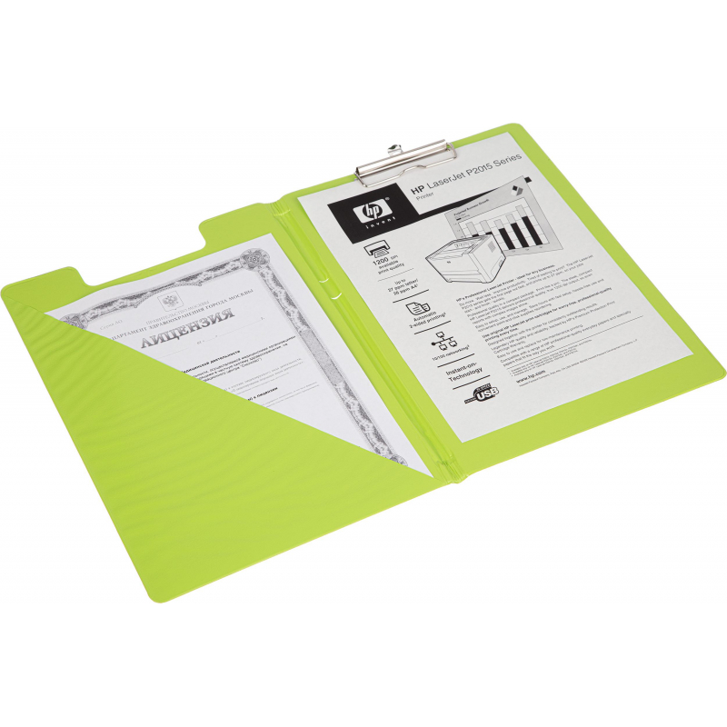 Папка-планшет формат А4 изготовлена из плотного картона, покрыта прочной ПВХ пленкой салатового цвета. Имеет откидную верхнюю крышку и выдвижной подвес. Имеет внутренний карман в цвет планшета на внутренней стороне верхней створки. Позволяет комфортно работать с документами на весу. Металлический прижим надежно удерживает листы и файлы.