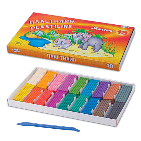 18 цветов, на восковой основе, не липнет к рукам, не токсичен. Материал для лепки. Окрашивается в различные цвета. Служит для выполнения фигур эскизов для скульптурных работ, небольших моделей, произведений малых форм.