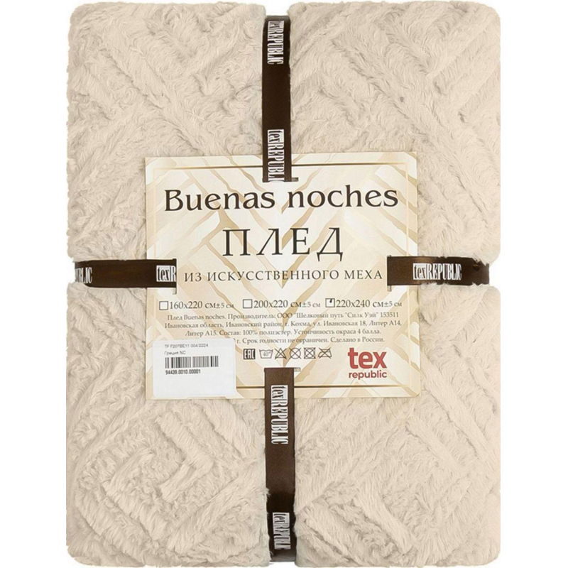 Плед Buenas Noches Греция искусственный мех 220х240 см бежевый.Плед изготовлен из искусственного меха с мягким ворсом. Он отличается хорошей плотностью и прекрасно держит форму.В отличие от натуральных изделий, данный плед можно стирать в стиральной машине при температуре 30 градусов. После стирки достаточно просто встряхнуть и расчесать, чтобы вернуть первоначальный вид.Искусственный мех - настоящее украшение спальни и гостиной. Он придает интерьеру уют и комфорт, а также согревает в холодную погоду. Плед можно использовать как покрывало как дома, так и на даче.Изделие также подходит в качестве подарка. Торговая марка Buenas Noches - это гарантия элегантности, стиля и качества. Плотность лицевой ткани составляет 240 г/кв.м.