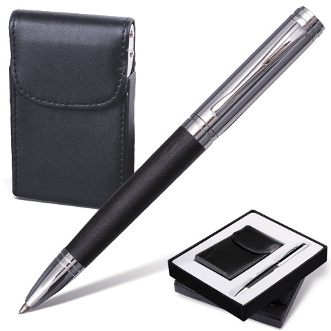 Стильный подарочный набор черного цвета. Хромированные детали добавляют аксессуарам изысканности. Набор включает шариковую ручку и визитницу.