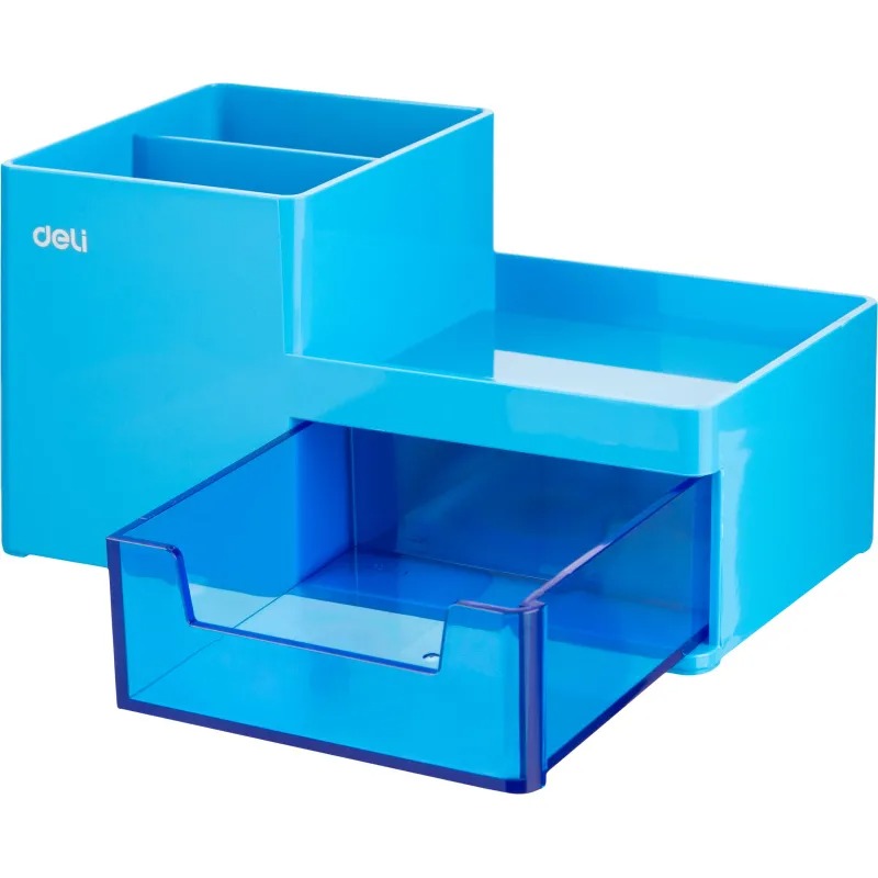 Подставка Deli Rio для пишущих принадлежностей с выдвижным ящиком. Настольный органайзер для хранения вещей отлично подойдет для хранения мелочей на вашем на столе. Многофункциональная подставка под канцелярские принадлежности станет настоящим украшением любого интерьера! Ненавязчивость форм, соответствующий дизайн, утонченность материалов. Функциональный и стильный органайзер для ручек и карандашей, изготовлен из высококачественного полистирола. Подставка под школьные принадлежности для рабочего стола имеет стильный яркий дизайн, вместительные отсеки. Всего четыре блока: два глубоких отделения для хранения карандашей, ручек, фломастеров, маркеров, ножниц, линеек и один для хранения стикеров , клея и других вещей. Также есть выдвижной ящик, куда можно положить ластик, скотч, скрепки. На дне изделия располагается противоскользящее покрытие, препятствующее скольжению и удержанию подставки. Большое количество отделений в совокупности с выдвижной полочкой позволяют использовать канцелярскую подставку как органайзер для косметики. Будет идеальным подарком для школьника, ребенка или подростка. Сочетается с другими изделиями коллекции Deli Rio. Используя товары этой коллекции Вы сможете подчеркнуть свою индивидуальность. Размер подставки: 92x175x90 мм. Цвет: синий.