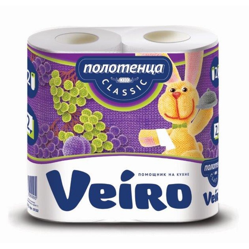 Полотенца бумажные Veiro Classic 2-слойные белого цвета, с тиснением. Изготовлены из экологически чистой целлюлозы. Незаменимы на кухне. Рулон длиной 12,5 м разделен перфорацией на 50 отрывных листов размером 25×22 см. В упаковке 2 рулона.