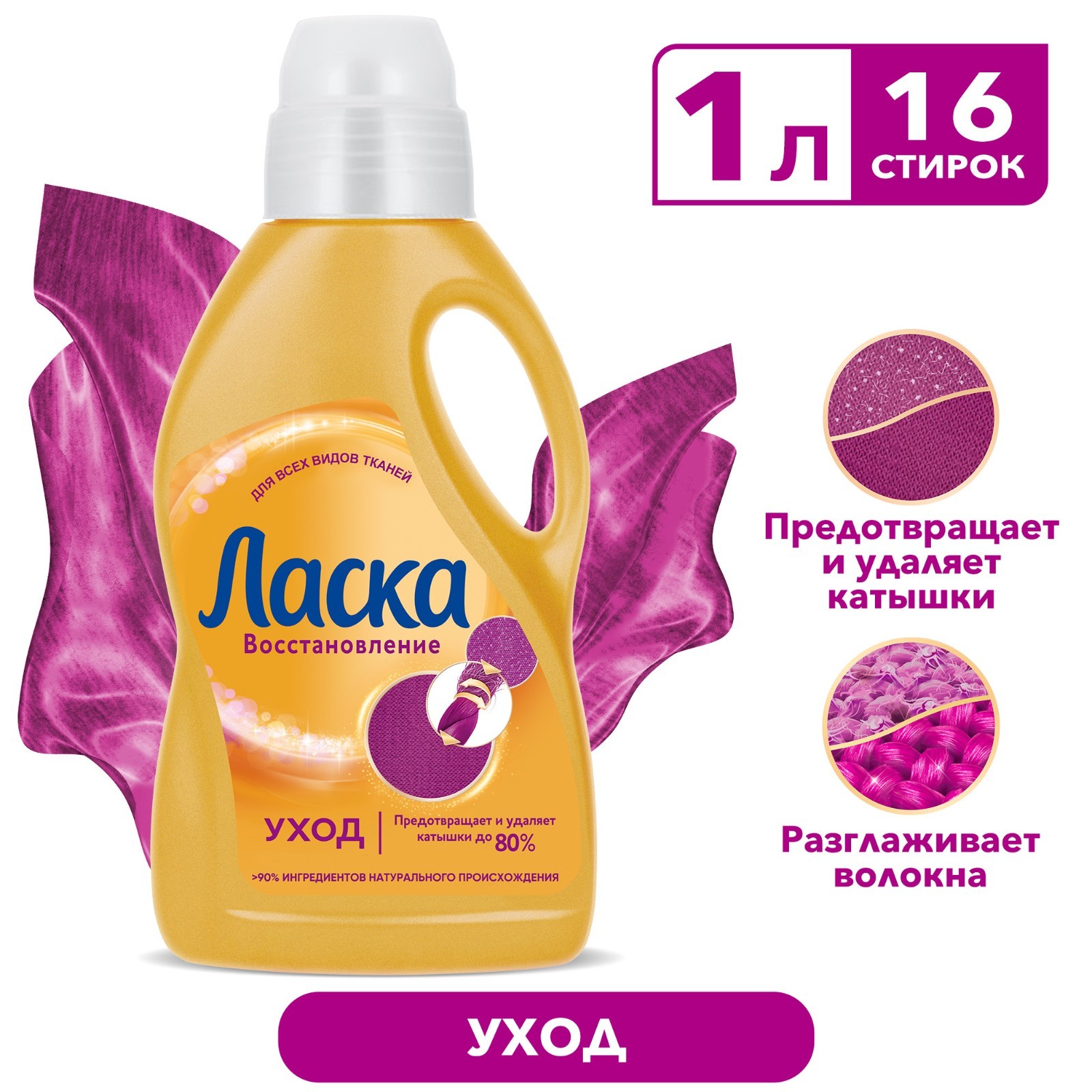 Жидкий порошок Ласка Восстановление УХОД эффективно и бережно отстирывает загрязнения на одежде и белье. В отличие от обычного стирального порошка, Ласка содержит специальные цветозащитные ингредиенты, которые обеспечивают стойкость цвета вашей одежды. Энзим целлюлаза в составе формулы ""срезает"" катышки с поверхности ткани до 80%, что делает поверхность более гладкой. Если цвет одежды с катышками смотрится серым или блёклым, то после их удаления цвет воспринимается более ярким из-за оптимального отражения света ровной поверхности ткани.