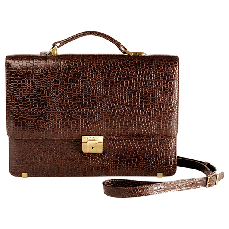 Универсальный кожаный портфель Delucci с одним отделением и заниженным клапаном коричневого цвета. Размер: 360*270*80 мм. Карман на внешней передней стенке находится под клапаном. Наборный пенал – на внутренней задней стенке. В комплекте предусмотрен плечевой ремень для удобства. Дизайн, имитирующий крокодиловую кожу, добавляет портфелю необычности и стиля.