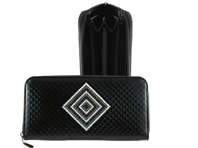 Портмоне большое "Elisir" из натуральной кожи. Коллекция «Алессандра» с композицией из белых и черных кристаллов "Swarovski". Закрывается на молнию. Внутри 4 отделения для купюр, 2 скрытых кармана, отделение для мелочи на молнии и 12 карманов для кредиток. Упаковано в бархатный мешочек в коробку с тиснением Elisir. Размеры (XxYxZ): 205х110х30