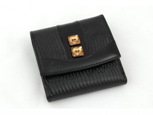 Портмоне компактное "Elisir", коллекция «Bergamo Black» из натуральной кожи с композицией из двух пришивных кристаллов Swarovski. На лицевой стороне сочетание кожи "рептилия" и гладкой чёрной кожи. Закрывается на кнопку. Внутри 2 отделения для купюр, 4 кармана для кредиток, отделение для мелочи на кнопке. Упаковано в подарочную коробку с тиснением "Elisir". Размеры (XxYxZ):90х100х20