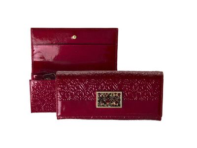 Портмоне женское Elisir, коллекция Mirella red с брошью Swarovski, из натуральной лаковой тисненой кожи. Передний клапан закрывается на кнопку. На задней стенке скрытый карман. Внутри 3 отделения для купюр, 2 скрытых кармана, глубокий карман, отделение для мелочи на молнии, 8 карманов для кредиток. Упакован в подарочную коробку с тиснением Elisir. Размеры (XxYxZ): 190х100х25