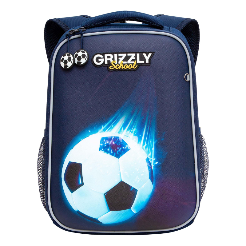 Школьный рюкзак Grizzly, одно отделение, объемный карман на молнии на передней стенке, боковые карманы из сетки, откидное жесткое дно, разделительная перегородка-органайзер, анатомическая спинка, укрепленное дно с ножками, нагрудная стяжка-фиксатор, резиновая ручка на стропе, петля для подвешивания, укрепленные лямки, в комплект входит мешок для обуви, имеются светоотражающие элементы, помещается А4, светоотражающие элементы с четырех сторон, держатель для школьной карты, светящийся в темноте рисунок. Размер изделия - 260x370x160 мм. Вес изделия - 871 г.
