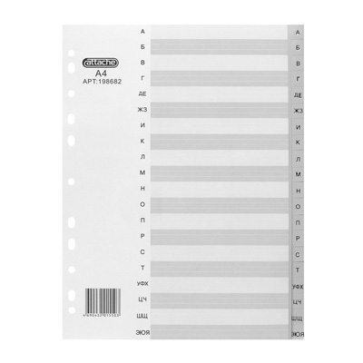 Разделители листов Attache формата А4 изготовлены из пластика серого цвета. Размер — 297×210 мм. Предназначены для учета и систематизации документов в архивных папках, облегчают поиск нужных позиций. Толщина пластика составляет 120 мкм. Универсальная боковая перфорация совместима с различными механизмами подшивания. Разделители листов, состоящие из 20 разделов, содержат буквенную маркировку. Для удобства и быстроты поиска имеется титульный лист.