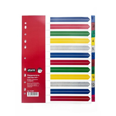 Цветные разделители листов Attache Selection формата А4+ изготовлены из полипропилена толщиной 140 мкм. Размер - 246*305 (А4+). Разделители имеют табуляторы с цифровым индексом на 12 разделов. В комплект входят вкладыши для маркировки табуляторов. Уникальная усиленная перфорация совместима с различными типами папок.