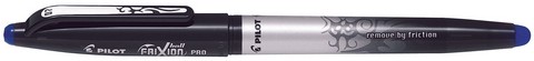 Гелевая ручка Pilot серии Frixion Pro современного дизайна. Эргономичный корпус серебристо-черного цвета в зоне захвата снабжен ластиком и резиновой манжетой, препятствующей скольжению пальцев. Чернила синего цвета обесцвечиваются при увеличении температуры до 60 °C или под воздействием трения. Толщина линии письма — 0,35 мм. Возможно использование сменных стержней c диаметром шарика 0,7 мм. Материал корпуса подходит для тампопечати.