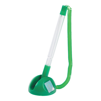 Многоразовая шариковая ручка с синим цветом чернил. Модель в прозрачном корпусе с деталями зеленого цвета специально разработана для офисов и различных учреждений: с одной стороны она крепится к пластиковой пружине, а с другой — к специальной подставке с липким основанием для установки на столах или тумбах. Ручка комплектуется сменным стержнем, толщина линии составляет 0,5 мм.