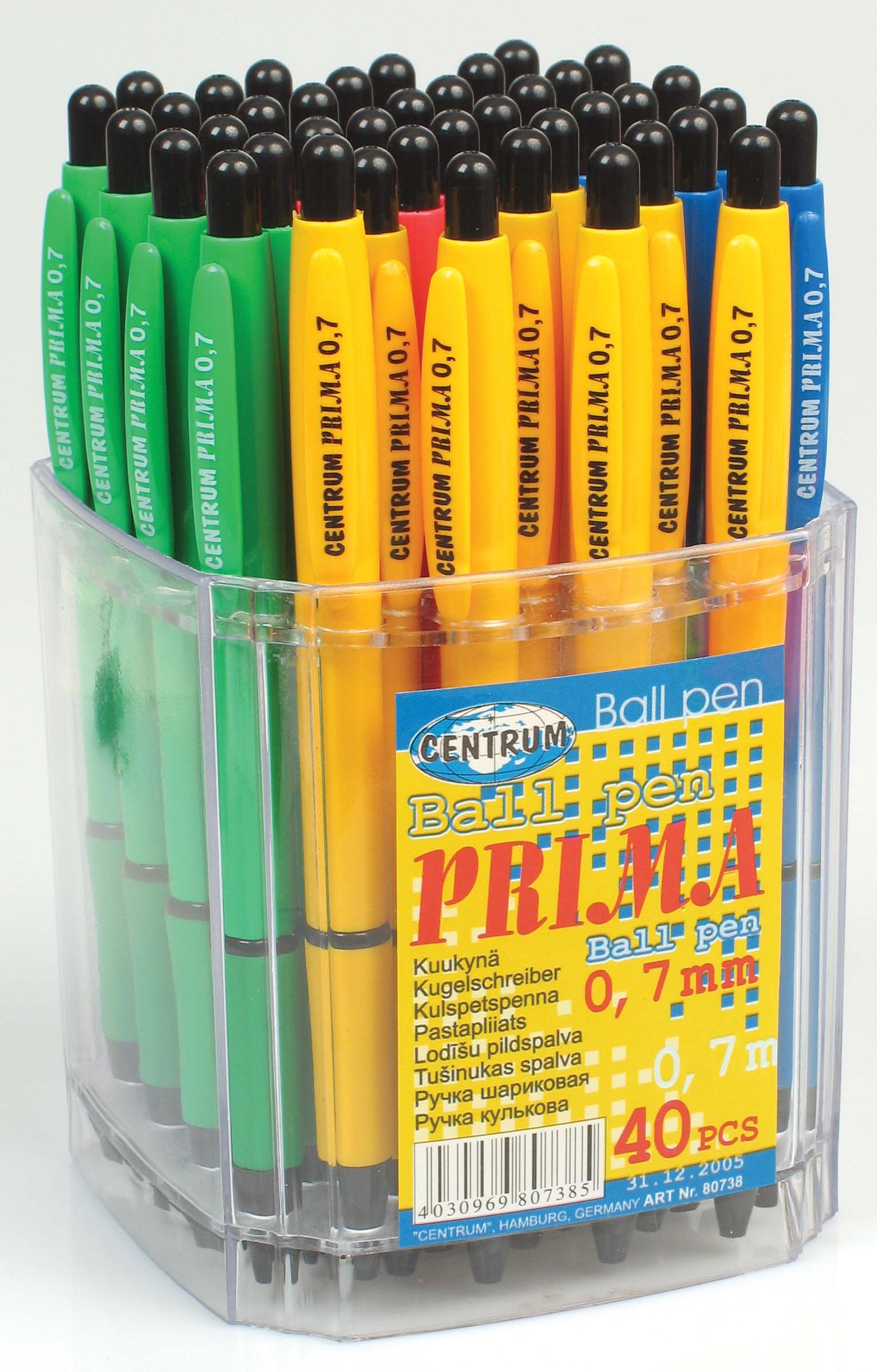 Авторучка шариковая синяя PRIMA 0,7 мм в цветном пластиковом корпусе с эргономичным резиновым держателем, с клипом в цвет корпуса.