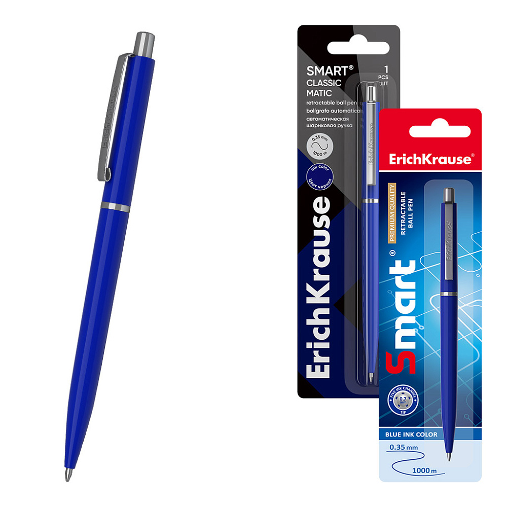 Классическая автоматическая шариковая ручка с металлическим клипом, стандартным типом пишущего узла, технологией письма Super Glide и заменяемым стержнем. Ручка имеет непрозрачный глянцевый круглый корпус синего цвета. Цвет корпуса соответствует цвету чернил. 5-канальный пишущий узел с диаметром шарика 0.7 мм в сочетании с быстросохнущими чернилами обеспечивает мягкое и быстрое письмо. Длина непрерывной линии составляет 1000 м при толщине 0.35 мм, что является высоким показателем в своей категории. Ручка Smart имеет строгую, классическую форму и рекомендована офисным сотрудникам в качестве надежной ручки для повседневного использования.