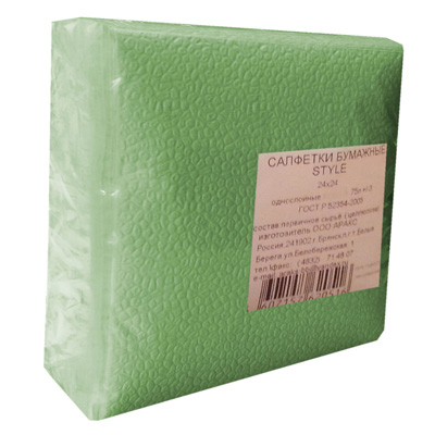 Однослойные сервировочные салфетки «Пастель» изготовлены из бумаги пастельно-салатового цвета с тиснением. Сложены вчетверо, размер — 24×24 см. Поставляются по 75 штук в полиэтиленовой упаковке. Материал — 100% целлюлоза.