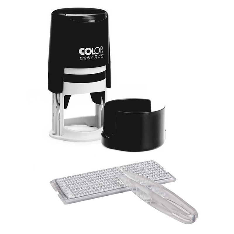 Круглая самонаборная печать Colop Printer R45/2 с прочным корпусом из пластика. Диаметр — 45 мм, набор текста производится по внешнему кругу, внутреннему кругу, внутренним полукругам сверху и снизу, в горизонтальных строках. В комплекте — касса букв разного размера, пинцет для набора, сменная штемпельная подушка с синими чернилами. Окрашивание происходит автоматически — подушка вставляется в корпус.