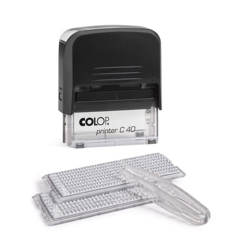 Самонаборный штамп Colop Printer 40-Set-F с прочным корпусом из пластика. Максимальный размер текста в прямоугольном оттиске: без рамки — 6 строк по 37 (основной шрифт) или 28 (большой шрифт) знаков, с рамкой — 4 строки по 33 (основной шрифт) или 24 (большой шрифт) знаков. В комплект входят две кассы букв, пинцет для набора, сменная штемпельная подушка с синими чернилами. Окрашивание происходит автоматически — подушка вставляется в корпус.