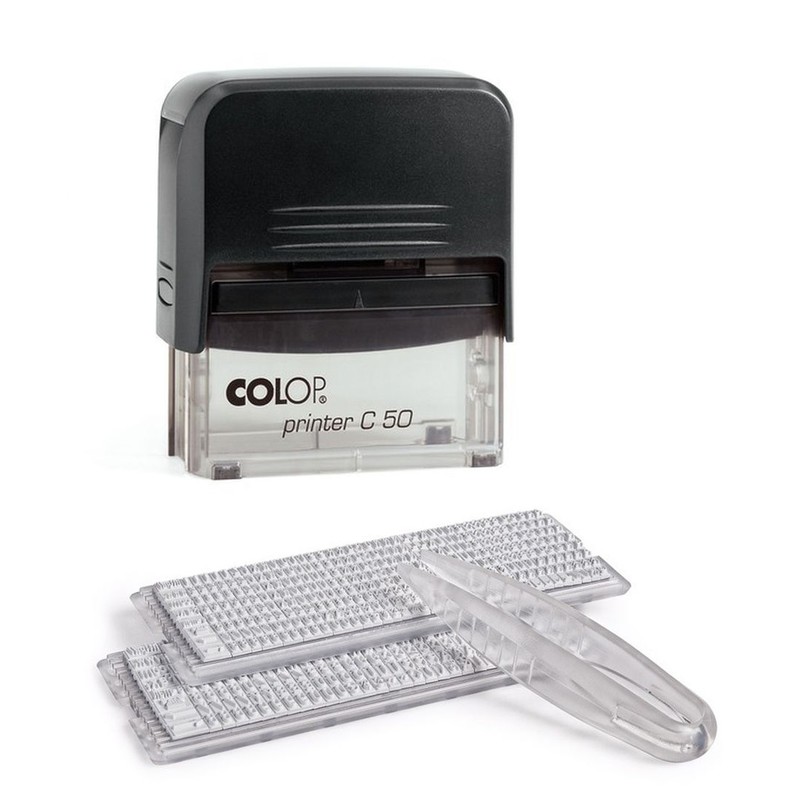 Самонаборный штамп Colop Printer 50-Set-F с прочным корпусом из пластика. Максимальный размер текста в прямоугольном оттиске: без рамки — 8 строк по 43 (основной шрифт) или 33 (большой шрифт) знаков, с рамкой — 6 строк по 39 (основной шрифт) или 29 (большой шрифт) знака. В комплект входят две кассы букв, пинцет для набора, сменная штемпельная подушка с синими чернилами. Окрашивание происходит автоматически — подушка вставляется в корпус.