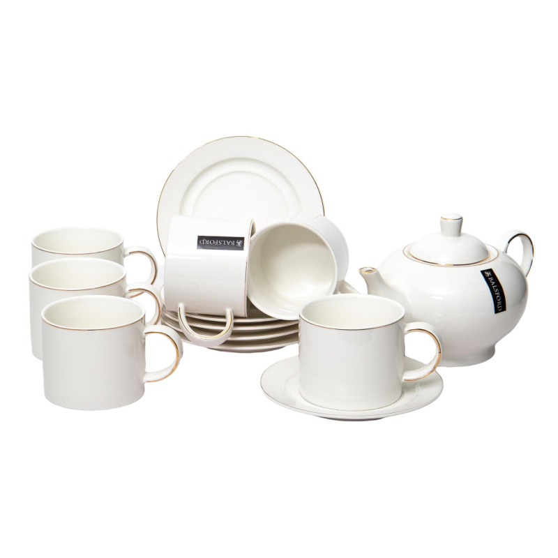 Сервиз чайный Basford Грация (101-01051) на 6 персон (13 предметов) выполнен из высококачественного костяного фарфора - материала, безопасного для здоровья и надолго сохраняющего тепло напитка. В комплекте 6 чашек, 6 блюдец, чайник. Несмотря на свою внешнюю хрупкость, каждый из предметов набора обладает высокой прочностью и надежностью. Изделия украшены тонкой золотой каймой. Оригинальный дизайн сделает этот набор изысканным украшением любого стола. Набор упакован в подарочную коробку. Объем чайника: 750 мл. Объем чашки: 280 мл. Диаметр чашки: 8 см. Высота чашки: 6 см. Диаметр блюдца: 13 см. Возможность мытья в посудомоечной машине: да. Возможность использования в СВЧ-печи: нет.
