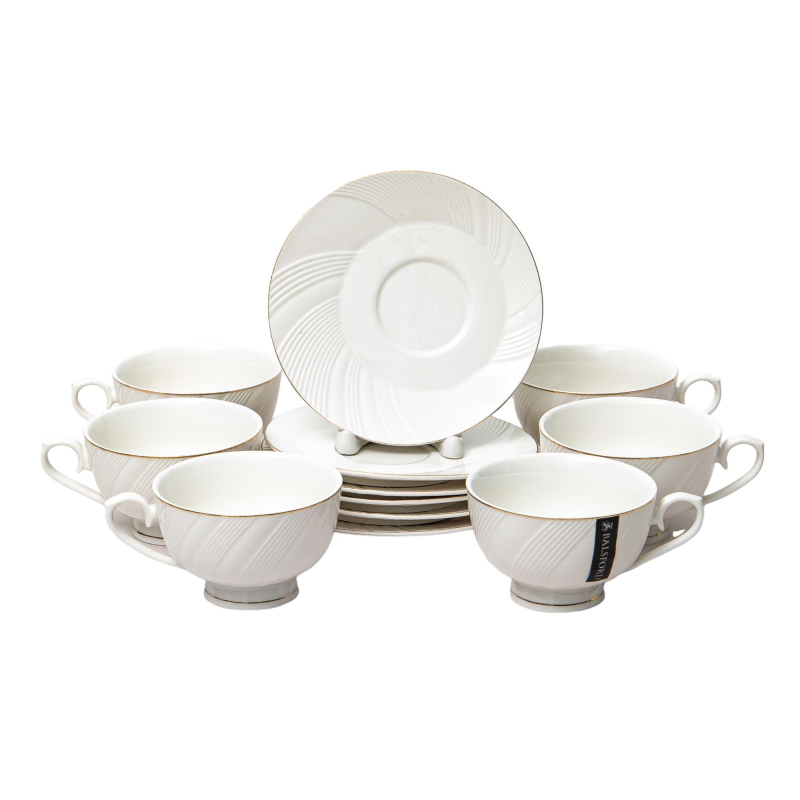 Сервиз чайный Basford Грация (101-01076) на 6 персон (12 предметов) выполнен из высококачественного костяного фарфора - материала, безопасного для здоровья и надолго сохраняющего тепло напитка. В комплекте 6 чашек, 6 блюдец. Несмотря на свою внешнюю хрупкость, каждый из предметов набора обладает высокой прочностью и надежностью. Изделия украшены тонкой золотой каймой. Оригинальный дизайн сделает этот набор изысканным украшением любого стола. Набор упакован в подарочную коробку. Объем чашки: 220 мл. Диаметр чашки: 8 см. Высота чашки: 6 см. Диаметр блюдца: 13 см. Возможность мытья в посудомоечной машине: да. Возможность использования в СВЧ-печи: нет.