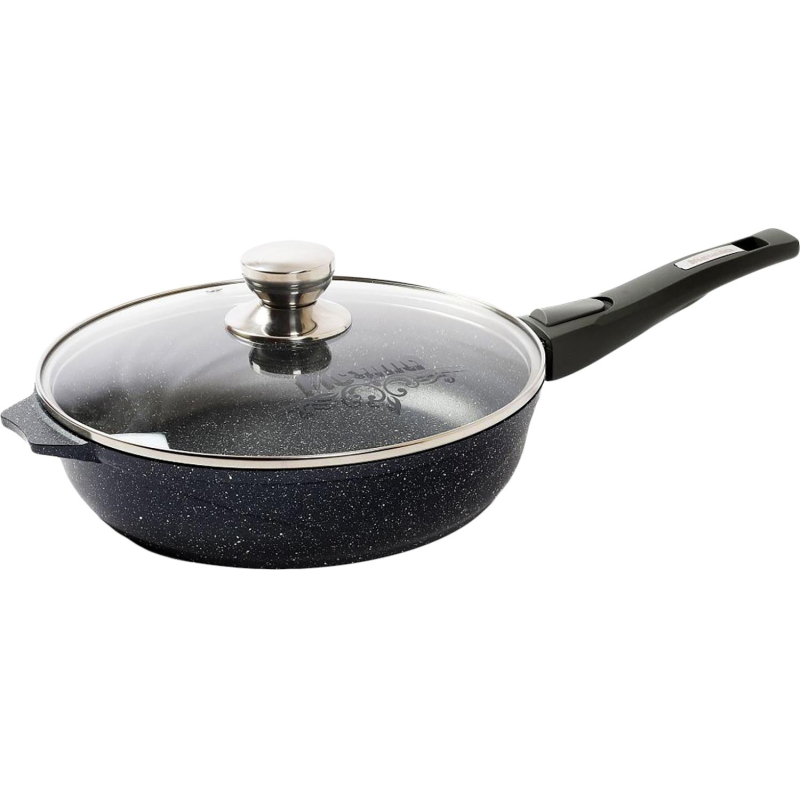 Сковорода Мечта Гранит black 24 см с крышкой/со съемной ручкой. Сковорода из литого алюминия диаметром 24 см со съемной ручкой и стеклянной крышкой серии Гранит Black. Серия Гранит black - это литая толстостенная посуда с антипригарным покрытием повышенной стойкости, разработанным фирмой Weilburger Coatings GmbH. Покрытие разработано на водной основе и не содержит перфтороктановую кислоту. Благодаря слою, упроченному кристаллами минералов, покрытие отличается особой износостойкостью и отличными антипригарными свойствами. Стеклянная крышка и съемная ручка soft touch в комплекте. Посуда подходит для всех типов плит, кроме индукционных. Можно мыть в посудомоечной машине.