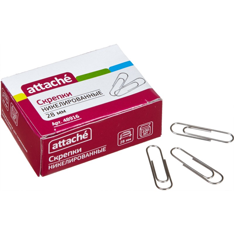 Скрепки Attache изготовлены из металла, никелированные. Имеют удобную закругленную форму, что позволяет надежно скреплять документы. Размер одной скрепки — 28 мм, 100 штук в упаковке. Количество упаковок в коробке: 10 упаковок по 100 штук.