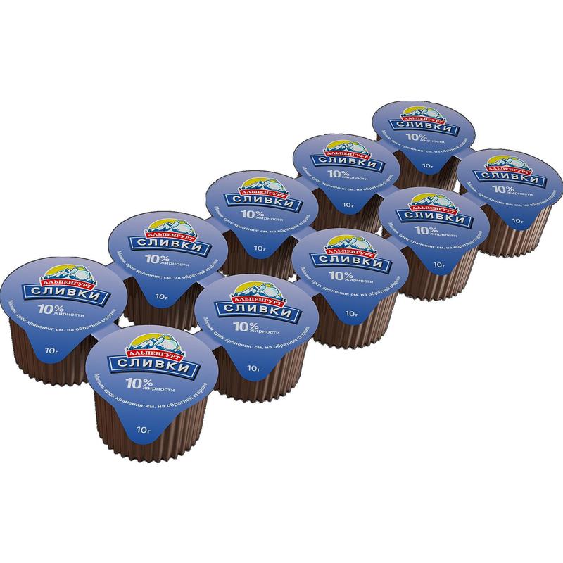 Сливки порционные «Альпенгурт» стерилизованные. Массовая доля жира составляет 10%. Состав: сливки нормализованные. Сливки поставляются упаковками по 10 порций, в каждой из которых 10 г.