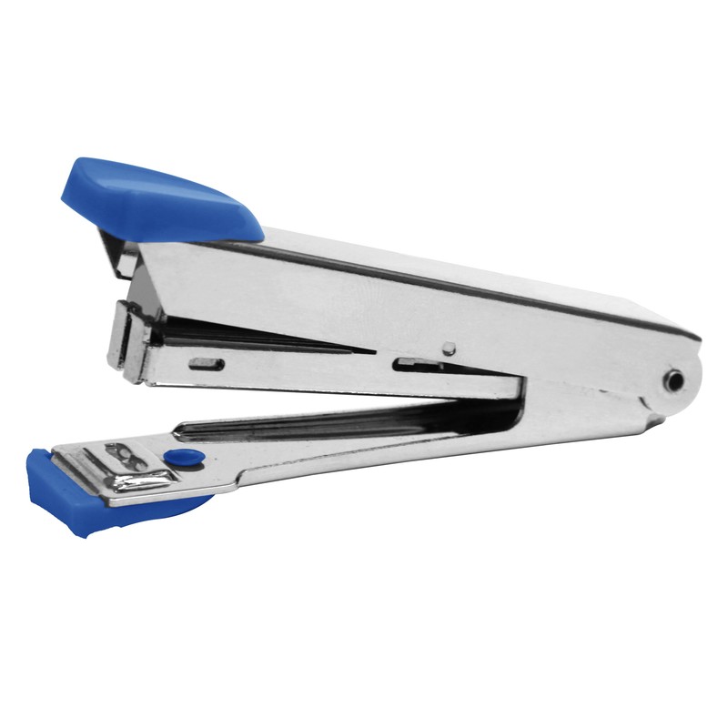 Степлер 8208 одновременно сшивает до 10 листов плотностью 80 г/кв.м. Позволяет производить сшивание плоским способом. Максимальная глубина закладки бумаги составляет 50 мм (5 см). Степлер имеет металлический механизм и корпус серебристого цвета. Оснащен синими пластиковыми ручками для удобного захвата. Работает со скобами № 10.