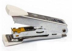 Степлер с пластмассовой вставкой для пальцев, корпус и рабочий механизм стальные, снабжен антистеплером.