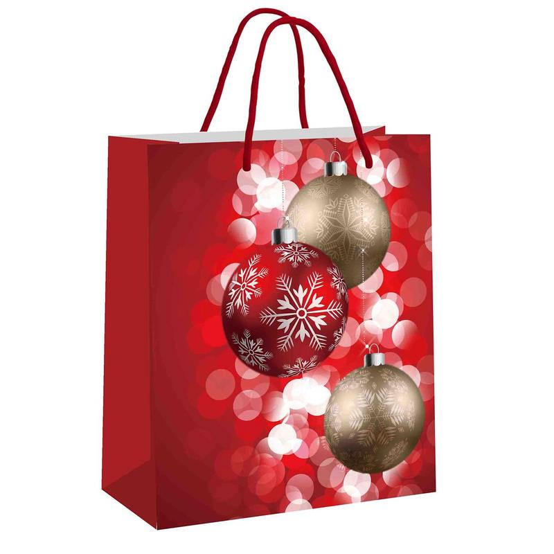 Пакет подарочный «Алое мерцание» изготовлен из бумаги и декорирован красочным изображением ёлочных шаров. Для удобной переноски на пакете имеются две ручки-веревочки. Размер: 11.1×13.7×6.2 см.
