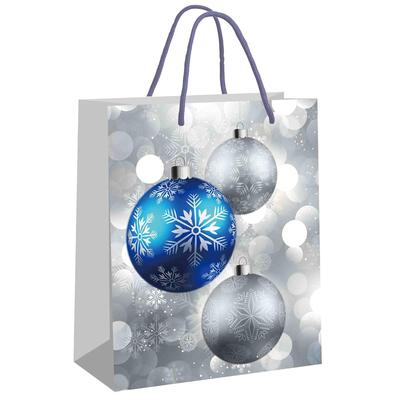 Пакет подарочный «Мерцание серебра» изготовлен из бумаги и декорирован красочным изображением ёлочных шаров. Для удобной переноски на пакете имеются две ручки-веревочки. Размер: 11.1×13.7×6.2 см.